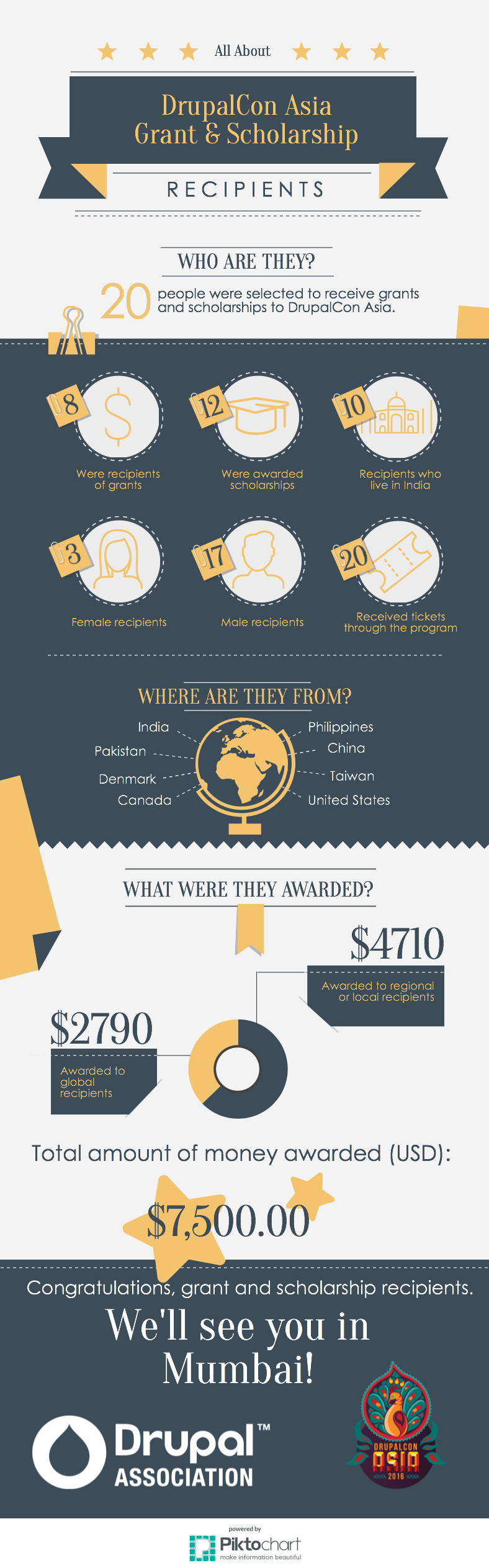 The grant and scholarship recipients for DrupalCon Asia have been selected. We had a lot of really great applications to look through, and narrowing down the winners was a difficult task. Still, we're pleased to announce that we have selected 20 recipients for grants and scholarships at DrupalCon Asia.