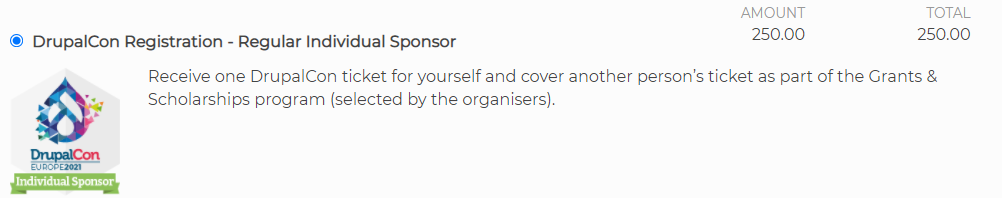 DrupalCon is where you connect with the community, learn and share knowledge, and help shape the future of Drupal - all while having fun! Your donation of EUR 250 as an Individual Sponsor includes a ticket to experience DrupalCon Europe AND provides additional support toward the goals of accelerating Drupal contribution and bringing new and diverse talent to the project.